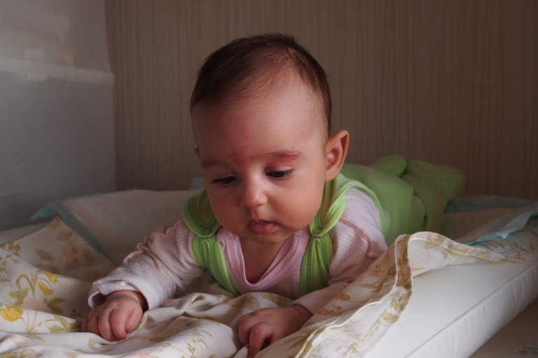 На лице у нас пятна.. Кто-то из хирургов говорит, что это винные пятна и надо будет их удалять лазером, а кто-то говорит, что это следствие родов и всё само пройдет. Я сама склоняюсь ко второму варианту и иногда мне кажется, что они чуть бледнее стали. В любом случае, минимум до года будем наблюдать, а там видно будет.