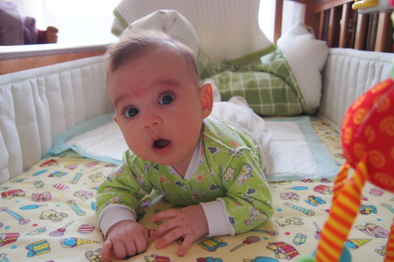 Хорошо лежит на животе и отлично в таком положении держит голову. В вертикали голова еще болтается, хотя чувствуется, что потихоньку крепнет. Лежа на животе осматривается по сторонам, болтает с рисунком на подстеленной пелёнке или с поставленной перед ней игрушкой. Иногда переворачивается с живота на спину. Со спины на бок тоже иногда получается, но чаще во время потягушек.