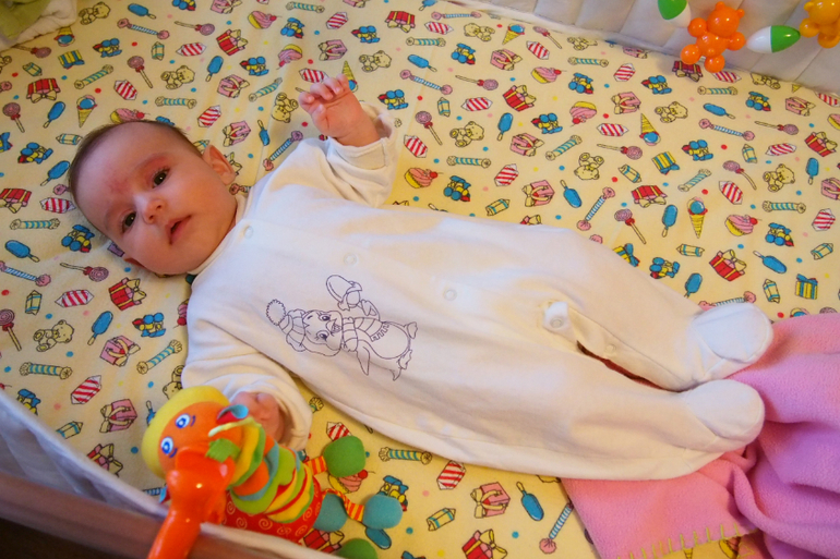 Родились мы 2640 и 49 см, сейчас рост 58 см и вес 5500. В первые два месяца прибавляли по килограмму, за третий месяц прибавили 650 грамм, т.к. доченька стала вести более активный образ жизни. А вообще, смотрю я на самые первые ползунки, в которых она тонула в первые две недели и не верю, что она вообще когда-то в них помещалась! Если бы не фотографии, я бы вообще с трудом вспомнила, какой она была всего лишь пару месяцев назад. Как-то всё смешалось в голове.. Ну и далее по порядку и фотографии Второй месяц для нас был самым сложным. Каждый вечер, а иногда и прям с утра, были крики, плач, капризы. С началом третьего месяца всё устаканилось, а сейчас она даже стала какое-то время сама лежать в кроватке и я могу пойти хоть поесть спокойно. И теперь мы капризничаем только вечером и то несильно, а скорее для галочки, чтобы привлечь внимание) Хотя иногда она сама себя заводит, обычно, когда уже дело подходит ко сну, и потом уже успокоить очень трудно. Отвлекается на магнитики на холодильнике, любит кухню, много там всего интересного и яркого висит на стенах. Еще сразу успокаивается, когда папа поднимает ее к потолку, прям улыбается)