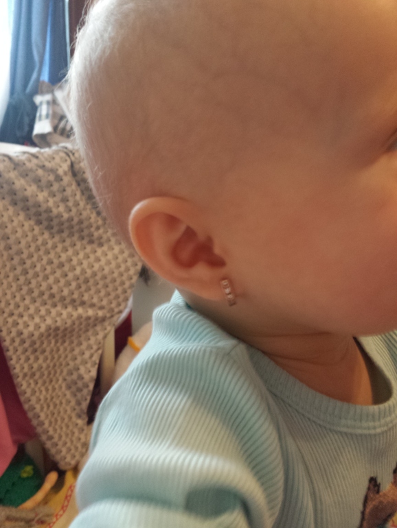 Еще мы прокололи ушки в этом месяце,уже даже переодели на золотые сережки,вот такая красота теперь.