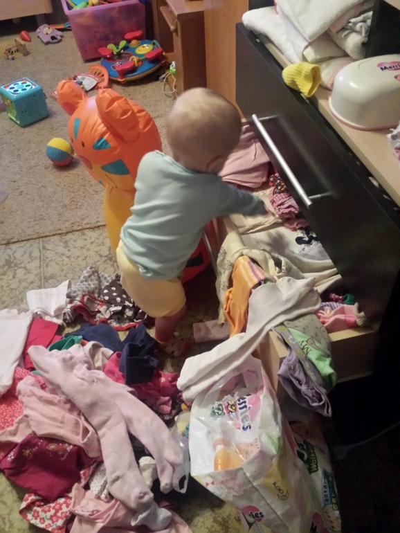 Вечно залезает во все ящики,пару раз прищемляла пальцы (не сильно,но плакала) и всё равно лезет,хулиганка жуткая!!! Живая,энергичная,громкая,в общем настоящая дочь своей мамы))))) в одну секунду может оказаться где угодно,бывает не успеваю за ней,ну это ничего,это нормально.