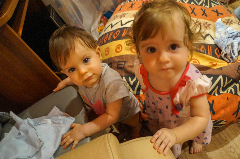 На этих выходных к нам в гости приходили знакомые с дочкой 1 год и 2 месяца. Но она родилась недоношенной и поэтому сейчас по параметрам абсолютно одинаковая с нами (72 см и 8000 гр). Так интересно было наблюдать за ними. Марьяша пыталась попробовать гостью на вкус, нечаянно поцарапала ей щеку. Так что старались держать дочу на расстоянии.