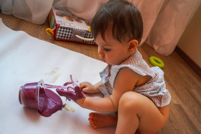 Ну, собственно, про творчество. Решили мы тут сделать доче пальчиковые краски. Сначала она с подозрением долго смотрела на них, а потом решила не мелочиться: