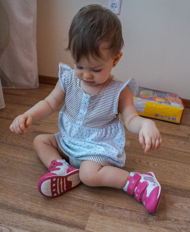 А это первые Марьяшины ботиночки. С таким удовольствием она топает в них, держась за ручки, на улице!