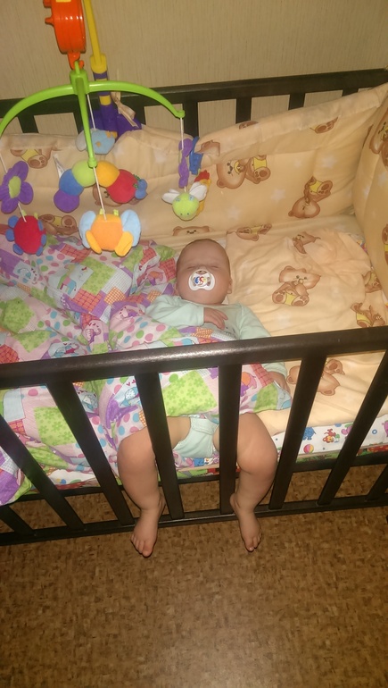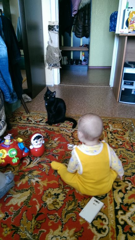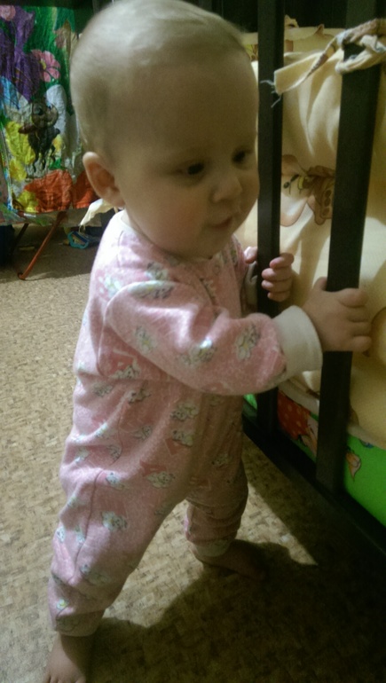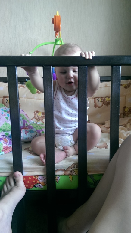 сначала у мячика, потом в кровате. А теперь уже везде. И пытается передвигаться стоя. Ползает активно. Коты наши только и успевают от нее прятаться. Комод открывает, со стеллажа все скидывает. Моя маленькая пакость))