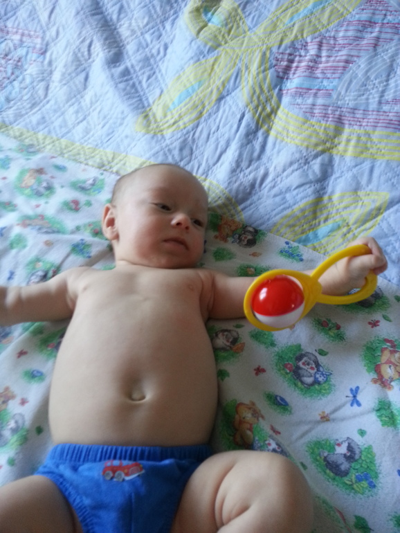 Физическое развитиеДержит погремушку! Сам!!! Уже несколько минут трясет ею и балдеет)))