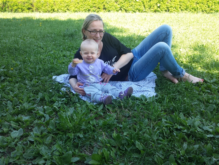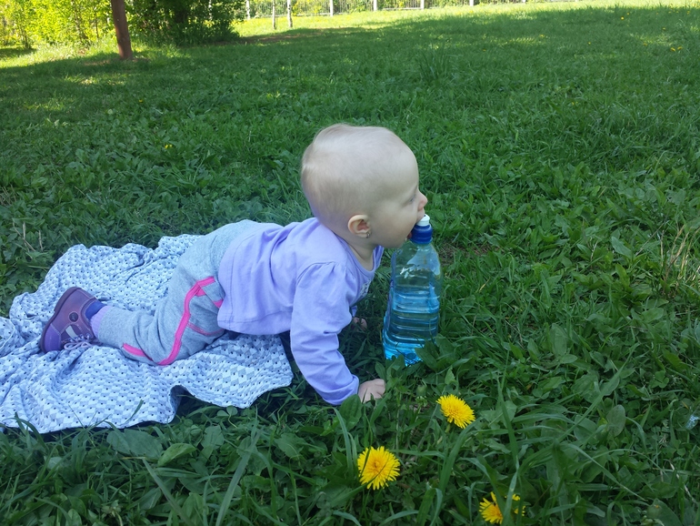 Итак,сегодня сходили к врачу: 7670 (набрали хорошо в этом месяце- 400г, с рождения - 4170), рост 70 ( с рождения 18). Имеются 6 зубов,2 на подходе. Ходит с 10 месяцев,сейчас довльно шустро,почти уже не ползает. Очень эмоциональная,шустрая,улыбчивая. Но вредина еще та))) проявляет характер. Любит при всей своей энергичности мелкие детали,может долго сидеть перебирать тряпочки (большущая любовь к тряпочкам), отлиплять и залеплять липучки на ботинках, может посвятить этому минут 20-30. Безумно смешно танцует,перебирая ногами,быстро-быстро. Кушает много чего с общего стола,главное достижение этого месяца - почти полностью отказались от банок. Стала есть супы,манную кашу,макароны,гречку, фрикадельки. Пыталась ввести рыбу- не понравилась. Ну и ладно. Ночью перестаем есть (уже несклько ночей не ест). Собирает пирамидку,играет в ладушки, показывает как шишка в лоб мишке попадает и как мишка топает ногой, показывает типа сорока-ворона,что то много рассказывает и объясняет,но мы не понимаем ее языка. Сегодня первый раз пропахала носом на детской площадке, долго ее жалела,бедняга моя. Через 20 дней уже будет годик,я в шоке,так быстро пролетело время и моя девочка стала такой большой и интересной))) смешная и трогательная. Очень сильно любим ее!!! Ну и немного фоток