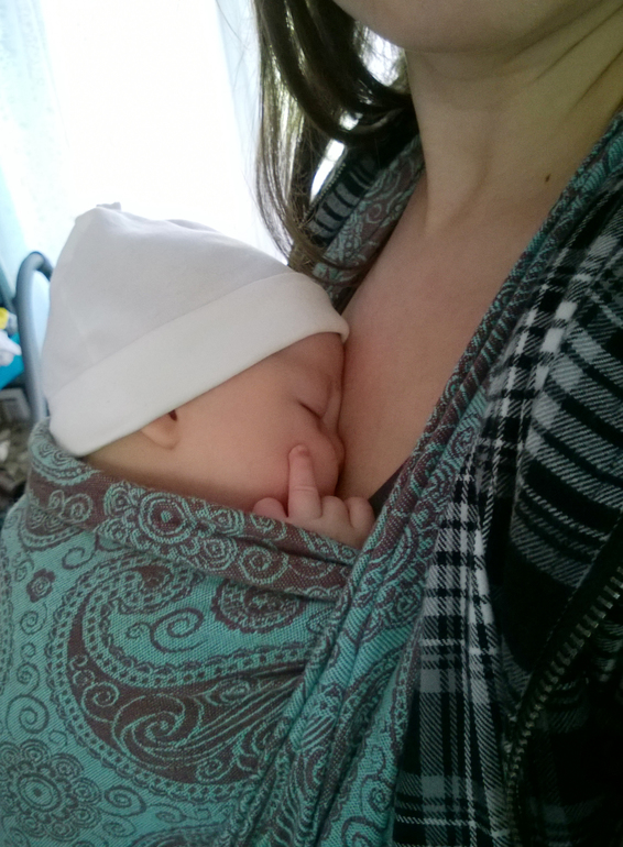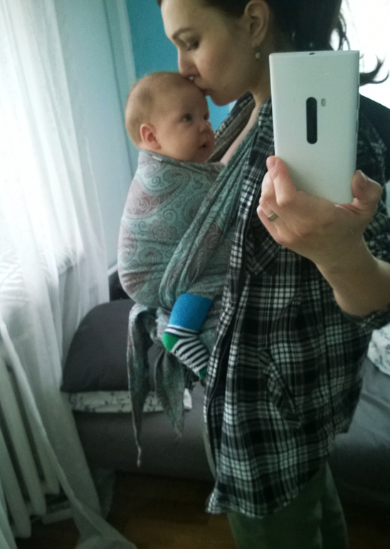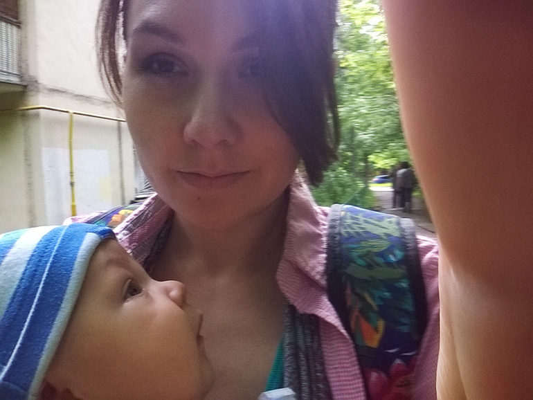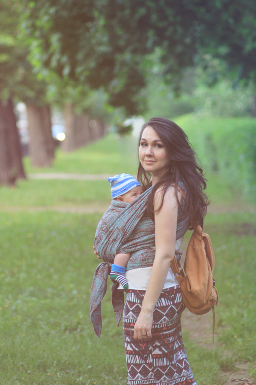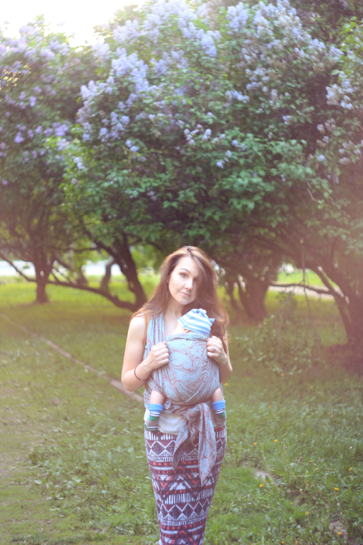 Мы - двухголовое чудовище от которого недоумевают бабули в транспорте и шарахаются мамули с колясками. Но сыну там безумно нравится. С недавних пор, мальчик минут 20 от прогулки сидит с гордо поднятой головой и рассматривает все вокруг. Особенно нравятся деревья. Мой юный ботаник. Потом через какое то время засыпает и нежно сопит у груди до конца прогулки.
