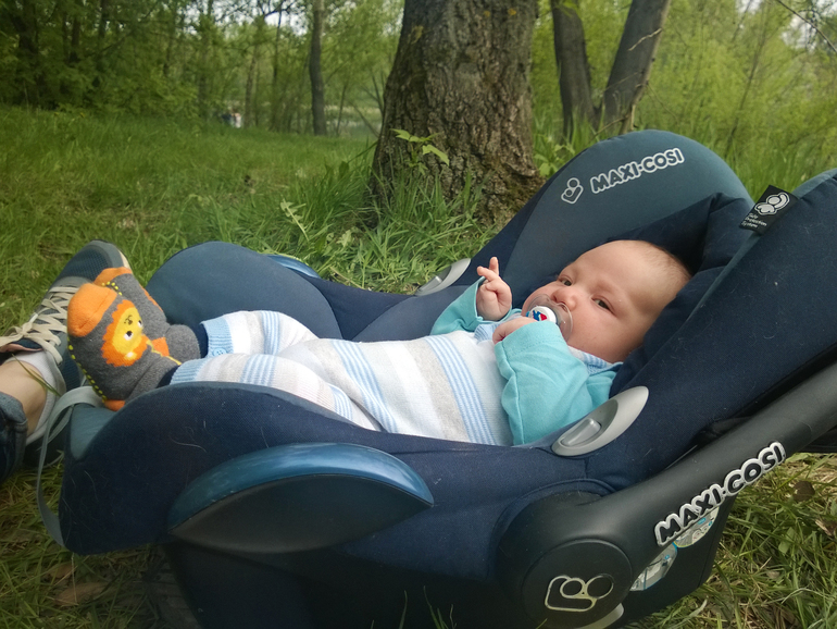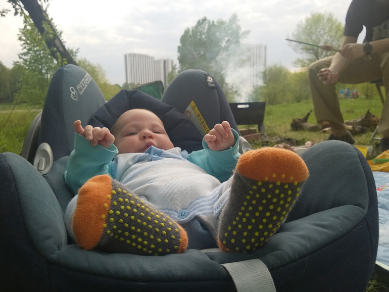Из недавнего. Влад очень достойно вел себя на первом выезде на шашлыки. Три часа на природе не спал и гордо восседал на своем авто троне. Даже не хныкал. Горжусь им.