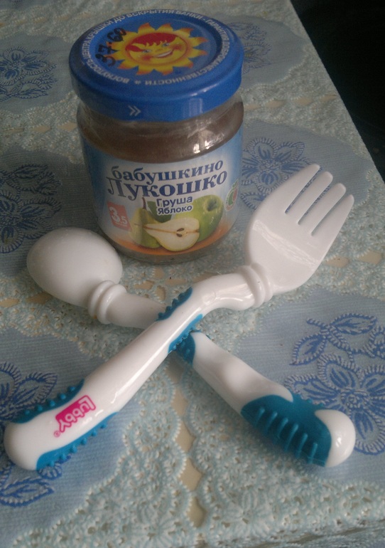 Приобрела сыну все принадлежности ( ложка, вилка, тарелка) и начинаем кушать кашу, нестле гречку))) Папа наш съездил по работе в город и прикупил нам пюрешек и кашек-будем подрастать и осваивать))