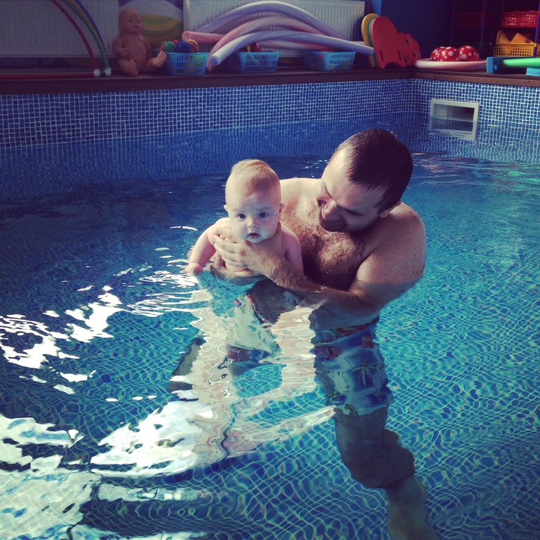 Продолжаем ходить на плавание, но если первый месяц мы плавали в огромном джакузи с тренером, то теперь с папой и тренером в бассейне