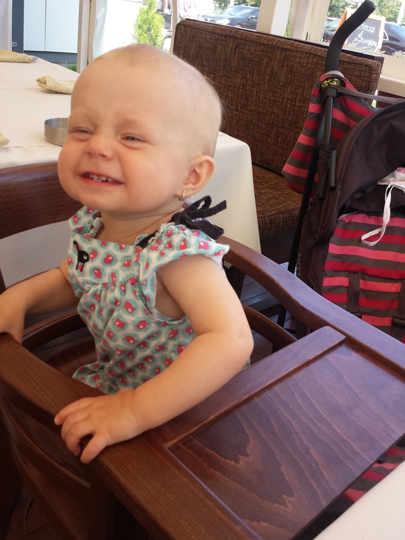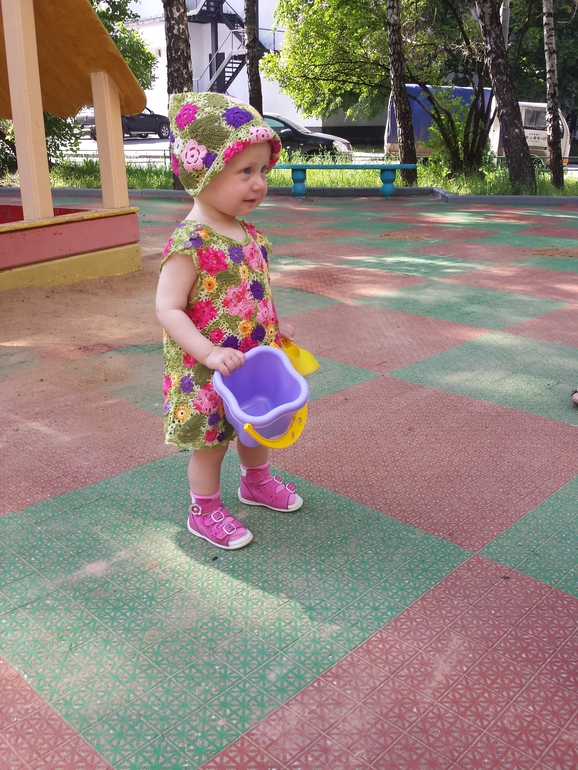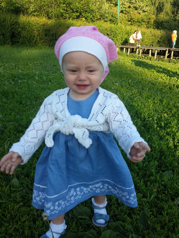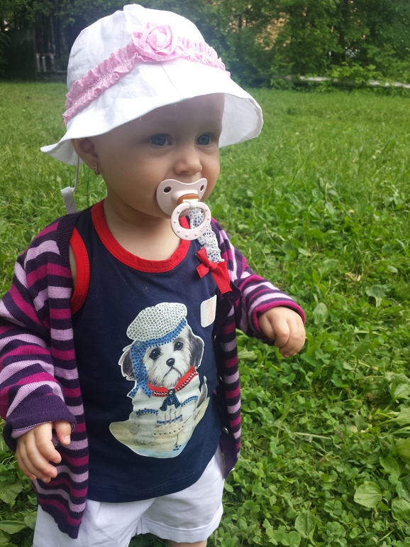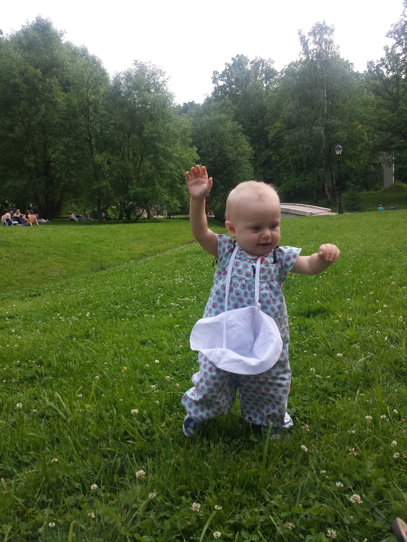 за это время очень многое в ней поменялось,теперь ее не запеленуешь и не заставишь лежать на одном месте,но мне это очень нравится,мне нравится смотреть как с каждым днем она учится чему-то новому, как общается и познает окружающий мир,как переваривает в своей маленькой головке новую информацию,очень интересно наблюдать за этими переменами. Итак к чему мы пришли к году: мы вполне миниатюрные барышни, рост 70, вес 7730 (в последний месяц перед годом потеряли где то 30г), одежду уже который месяц носим 68-74,даже 74 великоват еще. Очень хорошо ходит,научилась бегать и теперь с визгом убегает от меня по квартире и на улице пытается, надеюсь я такими темпами за лето скину еще пару-тройку кг. Очень самостоятельная мадам,руку вырывает на улице,надо САМА,лихо карабкается по лестницам на горку,только лови (страхую), очень любит песочницу,научилась копать и сыпать в ведерко. Играет в куклы,качает со звонким воем аааааа,укладывает в коляску,укрывает и с остервенением начинает укачивать аааааа (смешно до безумия,особенно если учесть,что коляска размерос нее саму). Говорит много,но на своём и выразительно. Из понятного: да,дать,на,мама,бу (бух). Животных говорит : собаку (по раззному то ав,а то как чехоточная собачка какая то получается),корову (не разжимая губ мычит ммммм),киска не воспроизводится печатными буквами,только по интонации понятно. Еще знает как машина едет. Знает ладушки,сороку,как моем ручки ну и что то такое еще,движений много повторяет. Обнимается,целуется (особенно с детьми),чистит зубы,одевает кофты (только на шею,руки еще не научились),пытается одеть памперс,носки,ботинки. Шмотки это наше всё!!! Оденешь ее и она начинает крутиться,чтобы сказали какая Лиза красивая