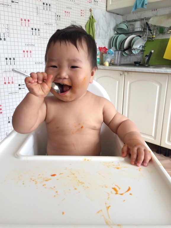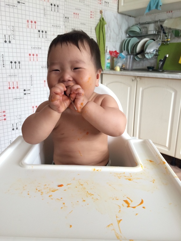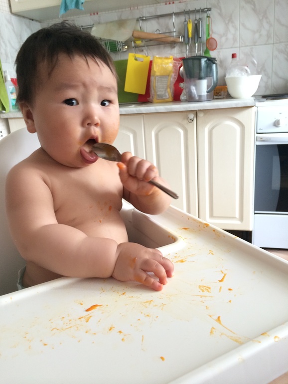 Зачерпываю пюре, и даю ему в руку. Вчера было яблочное пюре, это еще ничего.
