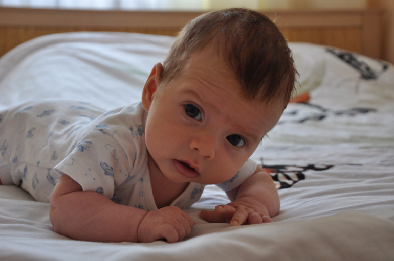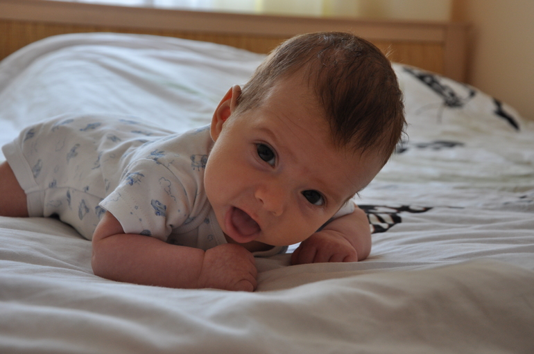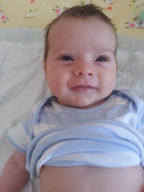 Марк стал регулярно улыбаться в ответ на улыбку или смех, и сам как будто смеётся только без звука), стал пробовать свои кулаки на вкус)) бьёт по игрушкам и хватает их уже) Активно гулит и издаёт разные смешные звуки, также следит за игрушками, больше нравится яркие цвета: жёлтый, оранжевый и салатовый, также активно держит голову и упирается на локти, переворачивается с животика на бок, а потом на спину когда устаёт лежать на животике, также активно плаваем в круге. И спим по 5-6 часов за ночь,ттт))