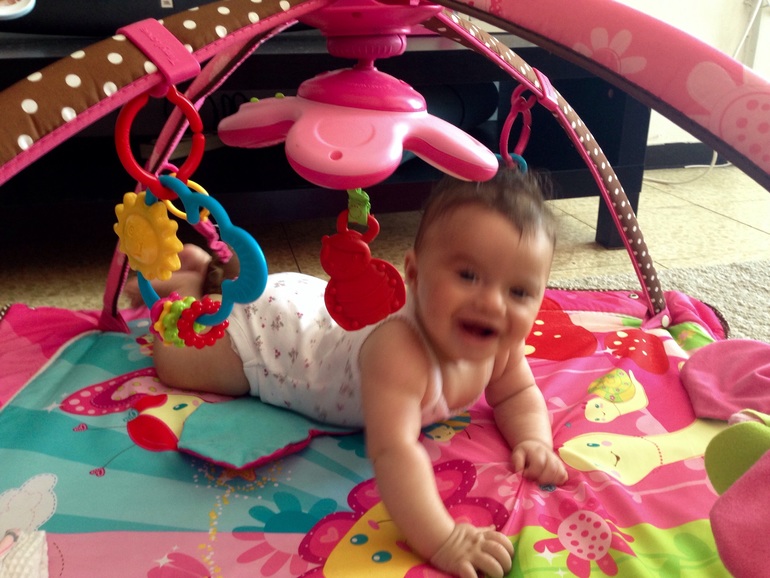 ХвастаемсяМоему сладкому пупсику сегодня 5 месяцев! Совсем уже большая и самостоятельная! Умеем переворачиваться во все стороны, ползаем по кругу и назад. Лежа на спинке, активно качаем пресс, пытаясь сесть, а на животике - делаем планкинг ))) знаем свое имя, кто такие мама и папа ( на русском и иврите) и собачки ( когда спрашиваем" где твои собачки?" Начинает смотреть на пол искать их, когда видит, улыбается и радостно визжит ))) хватаем и пробуем на вкус все, самые вкусные - собственные ноги )))