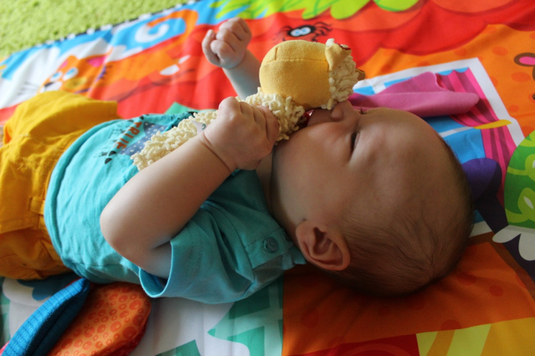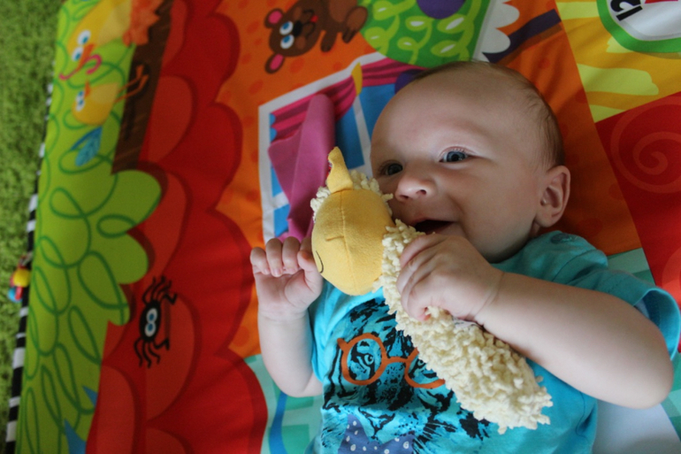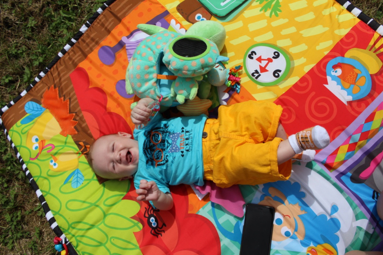 Любит играть с игрушками, любимую бабочку везде с собой берем, в коляску вешаем, на качели, просто с собой берем если идем на коврике играем.