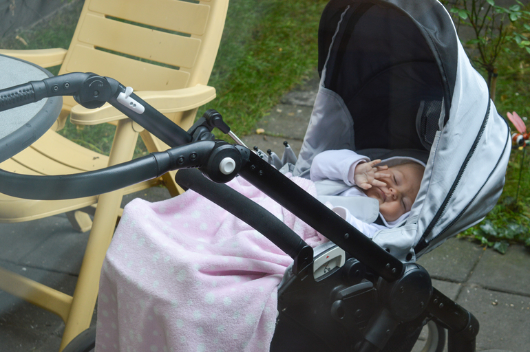 Спит, как придётся. Ночью - полностью или частично СС (после ночного кормления), днём укачиваю и кладу в кроватку, а если хорошая погода - качаю с коляске в саду. Иногда Белла делает такое лицо во сне, какое делала, когда только родилась. Ностальгия накатывает...