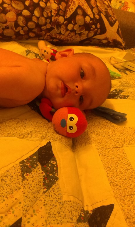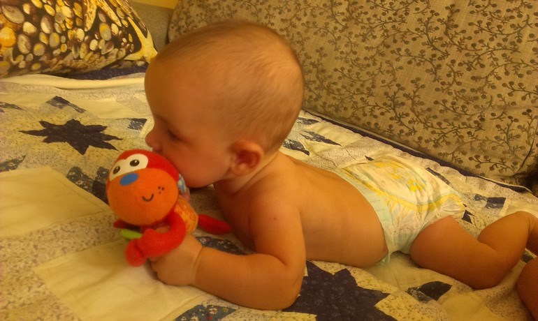 Удивляла нас своими новыми умелками. Стала хорошо поднимать головку на животе, но более того, сама пыталась встать на четвереньки!!!