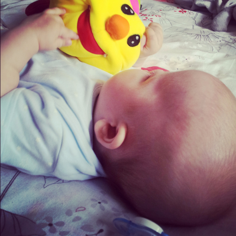 Умелки: агукает во всю, захватывает игрушки двумя руками, интересуется игрушками, любит на ручках смотреть на мир вокруг, переворачивается со спинки на живот только с моей помощью (когда тяну за ручку), сам ленится еще, лежит на животике, нашел свои руки и тянет их в рот.