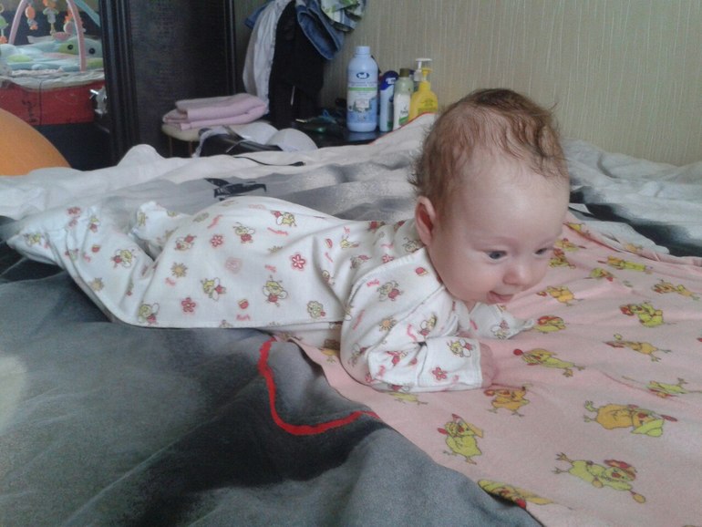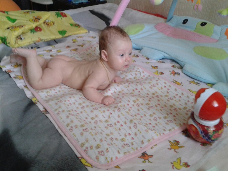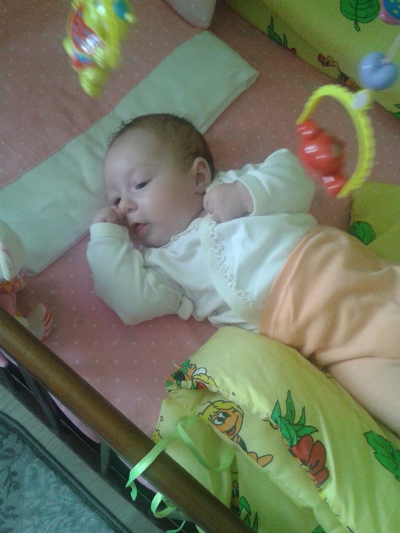 Из умелок: так же агукает, улыбается. Но теперь научилась пищать! звонко и тонко! Кулаки ворту-любимое занятие! Головку хорошо держим уже и лежа ни животике и на руках вертикально. Узнает родных, особенно маму )) Мы полностью на ГВ. ( хотя...я ей давла 1 раз облизнуть ябочко-нам очень понравилось!) Нравится наблюдать за мобилем и рассматривать бортики в кроватке (они желтенькие с пчелками) и лежать на коврике развивающем. Наблюдает за игрушечками. (уже так хочется, чтобы прям в руку взяла))