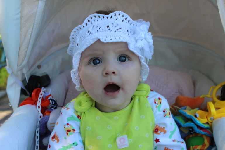 Из умелок, вертится во все стороны и очень ловко перекатывается с одной стороны нашей большой кровати на другую, поэтому была переселена на пол, к радости кота и соответственно дочери. Котейка пока держится на расстоянии, а дочь усиленно пытается его достать при этом визжит аж уши закладывает,так что если поползем скоро, то благодаря коту, а пока только раскачивается на четвереньках и ползем назад. В рот тянем все, обсалютно все без разбора, даже пол уже облизали, поэтому сделали дополнительную бортики к одеялу на полу, на которые дочери понравилось закидывать ноги лежа на спине с погремушой во рту еще что-то при это напевать с очень деловым и занятым видом. Еще любим играть с папой, точнее схватить за волосы и тянуть, при этом счастливее мордашки я еще не видела, даже словами не описать. Сидим пока только в коляске и стульчике для кормления, хоть и с ровной спинкой но, сама сидеть не хочет видимо рано еще. Но да я и не тороплю, успеет еще и поползать и сесть, а пока я наслаждаюсь более менее спокойным периодом.