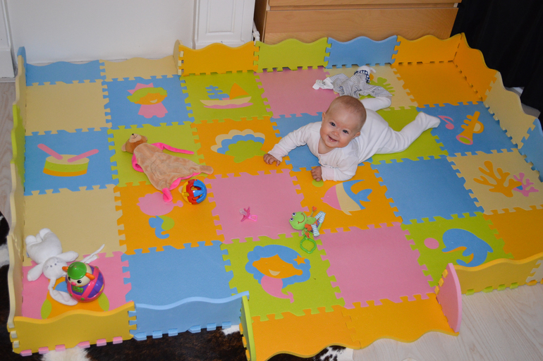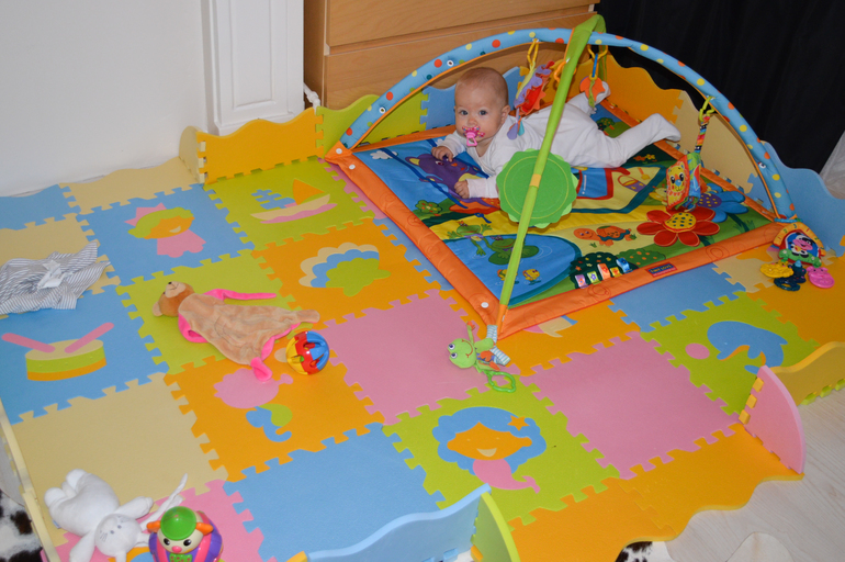 Беллу теперь можно со спокойной душой оставлять на полу, зная, что она не будет стукаться об него головой. Она, конечно же, проламывает заборчик, но для меня главное, что ребёнок занят делом :))) Можно убрать заборчик и сделать из этих кусочков волнистый кантик. Развивающий коврик пришёлся к месту и стал казаться очень маленьким. Но Белла всё ещё любит играть на нём.
