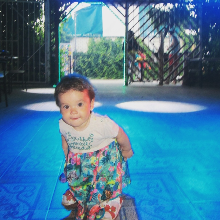 Вобщем отметили весело, во дворе поставили шатер, погода благоприятствовала! Даже дискотеку устроили, бабушка с дедом нам светомузыку подарили, Ева зажигала, огонечки ловила)