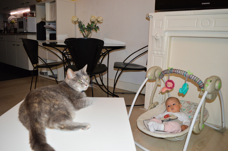 По-прежнему ни одного зуба, и мне уже поднадоело списывать периодические капризы на них, поэтому все непонятные явления я объясняю скачком роста. У Беллы выросла потребность в моём присутствии, спасает открытая кухня. Белла любит наблюдать, как я готовлю или делаю уборку. Я всегда стараюсь с ней взаимодействовать.