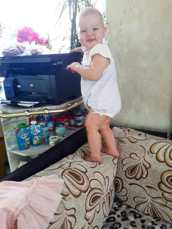 Умелок новых пока не особо, все так же ползает (правда быстрее, чем раньше), ходит вдоль опоры или за ручки. Научилась залезать на диван, да и вообще шкребется повыше везде, где только можно.