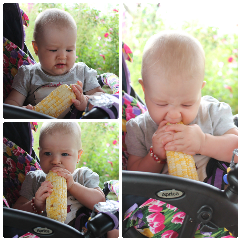 Вырастили за этот месяц аж 6 зубиков. Левая двоечка сверху, прорезалась ровно в 8 мес., остальные пять сидели долго и упорно (набухшие дясенки и слюни до пупа), затем, спустя 3 нед., показалась правая верхняя двоечка. А уже 31.08 проклюнулись сразу 4 (единички сверху, и двоечки снизу). Теперь у нас по 4 зубика сверху и снизу.