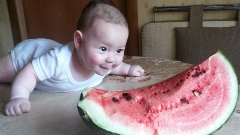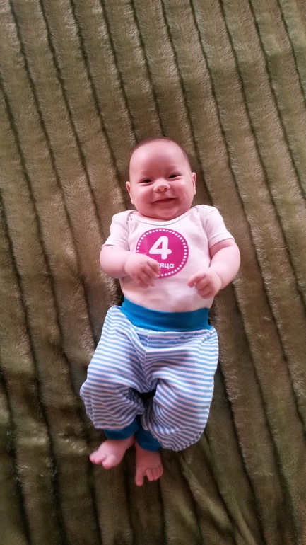 Лихо поворачивается на бока, несколько раз - на живот через правую сторону ( любимая). Любит обсасывать кулаки, пеленки и пару раз - мамины пальцы ( выплюнул сразу - невкусные, а я предупреждала). Из положения полулежа, если держим на ручках пытается сесть, опираясь на локотки. В ванночке любит лежать на животике. Голову поддерживаю, чтоб не нахлебался. Сегодня научился визжать. Повторяет и улыбается, пугает домашних.