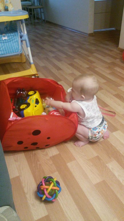 Физическое развитие: ползает со скоростью света, встает, сам стоит долго, ходит уверенно за одну ручку и так легонько за нее держится, лишь бы чувствовать опору... Ощущение,что стоит отпустить и...пойдет... Уже скоро затопает мой маленький...