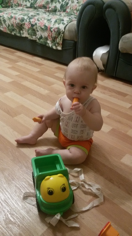 Психическое развитие и эмоции: за этот месяц глобальные прорывы... Понимает практически всеее! Ай яй яй говоришь,он в ответ машет ручками и аяяяя говорит) мамкает иногда) а так куча слогов,тарабарщина. Постоянно лопочет на своем,вопит:)) вновь полюбил погремушки, свистит в свисток и играет на дудке)) очень любит других деток,ко всем лезет обниматься и целоваться,мой нежный мальчик... Если хочет есть,ходит орет,бьет стул и карабкается на ногу. Стал ооочень улыбчивый, смеется, корчит хитрые рожицы) очень любит играть в ку-ку, причем приговаривает " кхукху". Хлопает ладушки,показывает полетели полетели,машет ручкой как привет и пока,но без связи с приветом и пока,просто так) показывает язык в ответ,играет на губах когда попросишь. Машинку называет бррр. Купаться готов часами))
