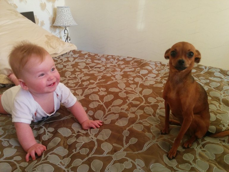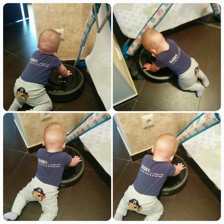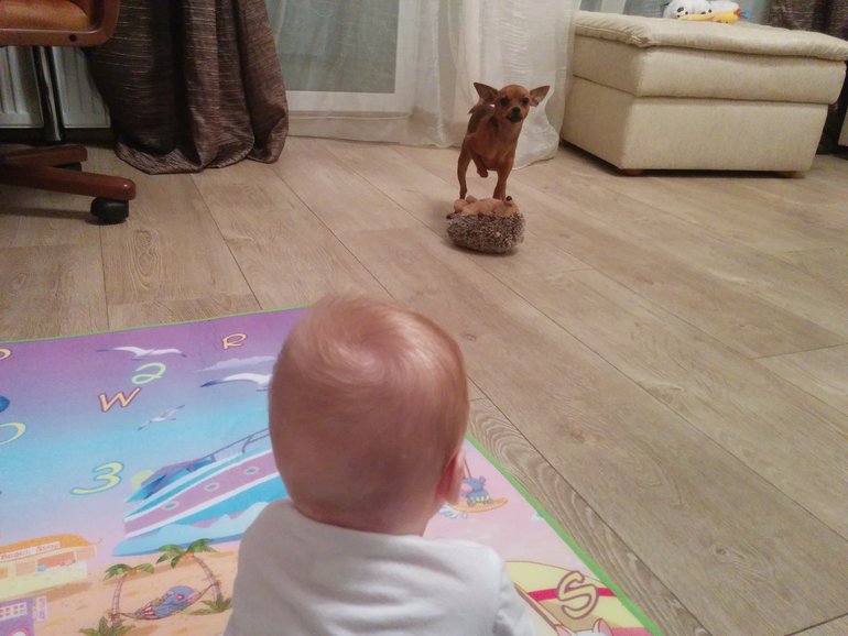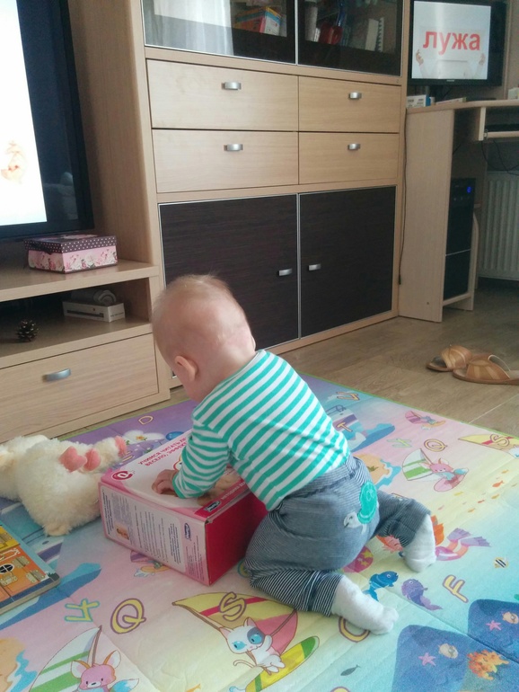 Сначала Ваня ползал совсем понемногу и медленно, а теперь, если задастся целью, может и всю квартиру пересечь. А целью обычно являюсь я. так что ползает тут за мной по квартире один спецназовец и пытается меня обезвредить)))