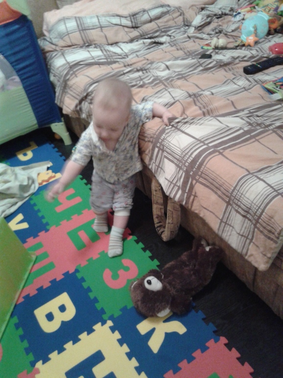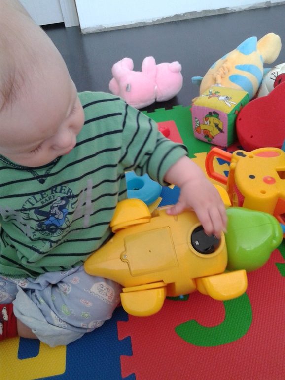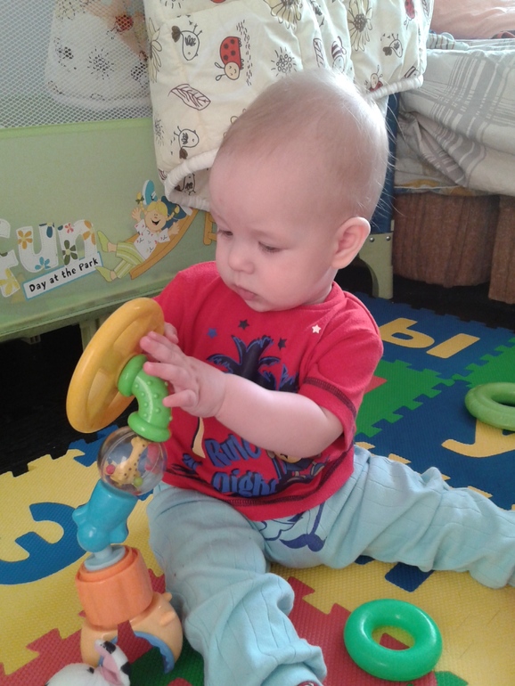 Игровая деятельность очень активная, все трогаем, пытаемся все отковырять, открыть, если не выходит психуем, бросаем и стучим. С пирамидкой, пока дела не продвигаются дальше стадии, перевернуть и вытряхнуть -ждемс дальше. Зато играеися с мячиком, берем и бросаем. Бросать, вообще это прям наше все, бросит смачно об пол и смотрит( бедные соседи, поражаюсь как терпят)