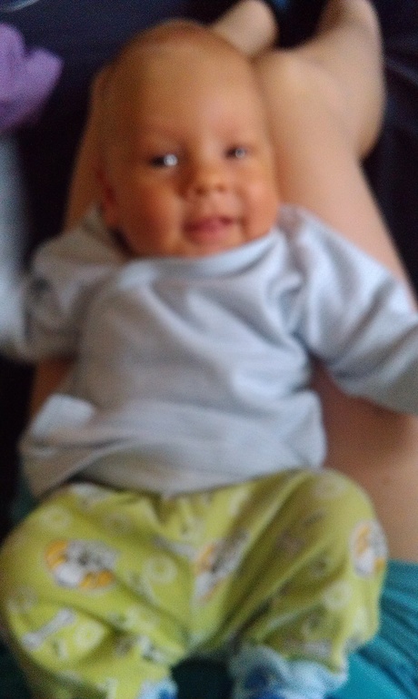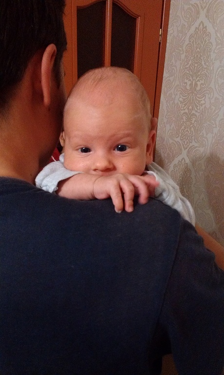 За месяц научился многому! Когда на ручках вертикально держит головку, правда иногда она предательски склоняется на одну сторону)) Агукает, нет не агукает скорее Ааааакает, очень протяжно, как "поёт" и при этом улыбается... чаще папе, или дедушке, вообще очень любит мужскую компанию, особенно папу! с папой даже иногда проскакивают хихики)) мне и бабушке улыбается редко( чаще серьезничает и хмурит бровки всматриваясь в лицо . Словить и сфотографировать когда улыбается сложно, это происходит очень быстро... вот что словила и то размытое фото получилось