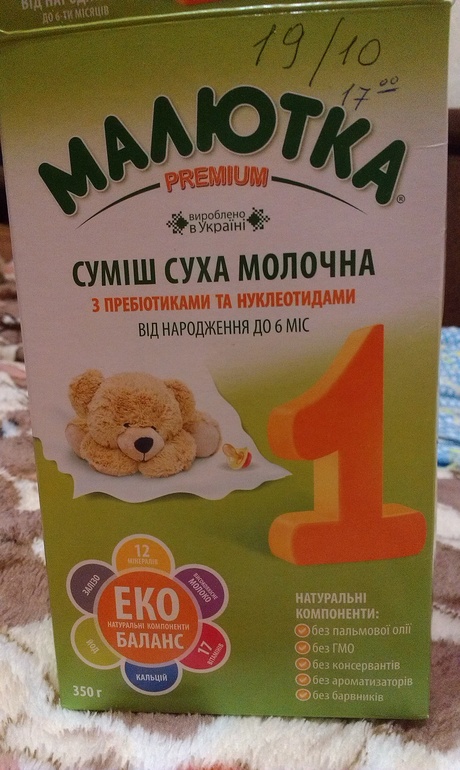 Питание у нас по прежнему смешанное, после больницы так и не получилось полностью вернуться на ГВ. Кушаем обе груди и доедаем смеси еще 60-70 мл. Кстати о смеси - еще в роддоме нас посадили на Симилак антирефлюкс, ибо срыгивал очень много, прям фонтанами. И еще в больнице появились проблемы со стулом... какал раз в 2 дня и то только с помощью трубочки /клизмы ... Дома начали есть грудь + смесь и проблемы с запорами продолжались, плюс через пару недель вернулись срыгивания фонтанами. смесь перестала помогать. И решила я её поменять, сначала начали переходить на Билакт , смесь намного дешевле, а состав витаминов тот же что и в Симилаке, пока я не вычитала что в ней пальмовое масло, и запор продолжал нас мучать... Потом позвонила моя сестра и посоветовала перейти на нашу украинскую Малютку, её доча на ней была когда пропало молоко. что мы и сделали ... уже через неделю малыш стал нормально какать! причем регулярно 2-4 раза в день! а то я уже устала мучать своего ребёнка клизмами и трубочками!. вот так выглядит наша чудо-смесь