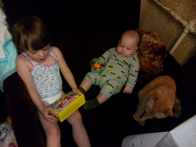 Утром встали - папа ей подарок оставил на мини-праздник! Пришли смотреть все =)