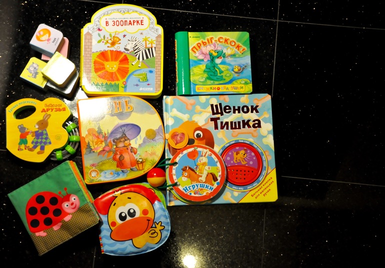 3. Книжки. Книжки-шуршалки, -пищалки, -погремушки, музыкальные книжки, любые для самостоятельного разглядывания. Если есть старшие дети, то можно попросить их почитать младшему. Мои с удовольствием показывают изображенные предметы, цвета, животных.. называют их и коротко рассказывают. Очень умилительное зрелище...