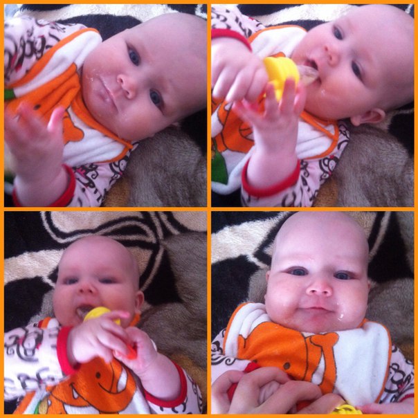 ✔️ даю бананчик по чуть-чуть в ниблере, пробовала еще яблочко, но от него Аня очень кривится и выплевывает.