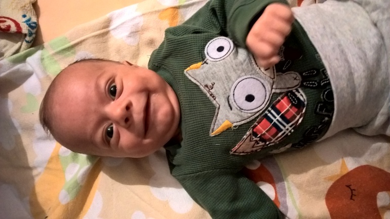 Улыбка во весь рот ))) и голову так хорошо держит, умница! И майка у вас зачетная ;)