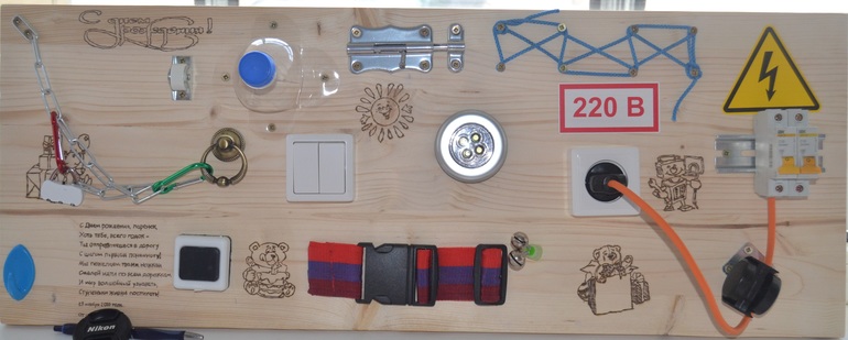 Еще бы малышу не понравилось! Настоящая розетка, выключатель, провода ... и во все можно пальцы затолкать и подергать. Здорово придумали, надо взять на заметку! (Интересно, а он потом не будет путать игрушку с настоящими предметами? )