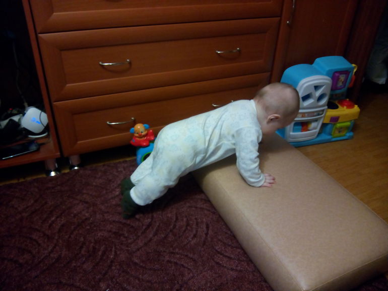Немного об этой подушке. Не нарадуюсь на нее... Именно на ней и Кристи сначала тренировалась, а потом встала! Надеюсь и Мишутка пойдет по тому же пути!