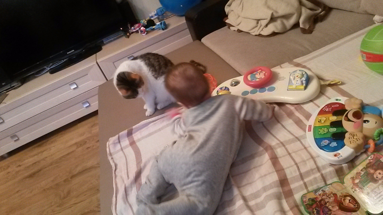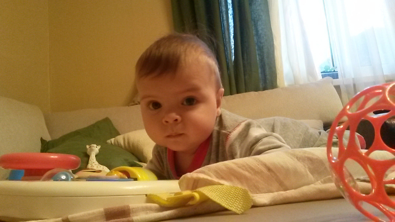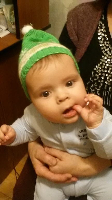 С мужем виснем в отделах игрушек. Все определиться не можем-рвет на части)))) На картинках коробок нарисовано 6+ и сидячие дети. Наш не сидит. За руки подтягивается,с шезлонг поднимается,с падушек пытается подняться,но не сидит. Сразу на бок и на пузо,либо встаёт. Но если сидя засмотрится на что-то,то спокойно сидит,хитрец. Но все ж вертикаль-Вот это самое то👍👍👍👍👍 Походить,поскакать,постоять у спинки стула. Ессссесссно держим ,иначе силы в ногах нет же. Желания с возможностями не совпадают😄😄😄 Неврологу пожалилась,что не сидит. Та повертела,посидела. Все ок! Сидит,но недолго, и координация ещё неалле. Мол,в 6 только присаживать начинают,а только в 8 сам сядет. Ну,пусть так И будет. Ползти хочет,нооооо....Встанет на четвереньки,покачается....Странно-на месте,не сдвинулся. Начнёт ноги выпрямлять и отталкиваться, а мордочкой в пол. И снова не сдвинулся!!!! Что за фигня???!!! Обидится ,захнычет. Мол на руки....и скакааааать!!!!!. Не знаю,как ему показать технику ползанья. Уж и руками перебиранием,и ноги толкаем. Недозрел видать ещё. В книгах пишут ,что в полгода деть обязан выдавать МА, ПА, БА. У нашего все КИ да ГА. Особенно прикольно,когда видит кису ,тянет к ней руки и КИиииии. И вот за пару дней до семи мес. выдал и МА ,и БА. Жаль,что это не мама и не баба((((( Купила к полугодию набор развивающий "Школа семи гномов". Пока не увенчались успехом мои потуги заниматься с книжками. Данная литература Гошу интересует только как жевательная штука. Ему отчего-то нравится бумажная продукция)))) Пожевать!!!!! Так по недоглядке моей бумажная иконка была разжевана так,что я потом пазл собирала. Куска недосчиталась. У Гоши два зуба и лезут верхние. Уже разок слетел с дивана. Я до сих пор приглядываюсь к нему. У невролога снова медотвод от прививок из-за расширенного ликворного пространства. На завтрак и ужин пробуем есть каши. В обед овощи. Не скажу,что трескается за обе щёки,но что-то ест. А вот сиську терзает чуть ли не каждый час. Как маничка какая!!!!! Один сосок прокушен-вспомнила первые месяцы кормления))))