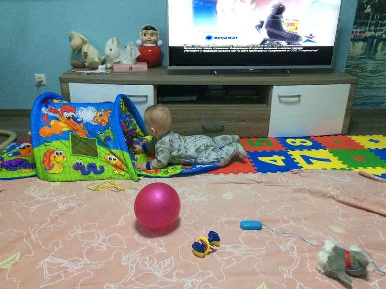9.30-9.50 завтракаем. Муж моет посуду, я беру сына, одеваю памперс и мы идем ползать в зал)