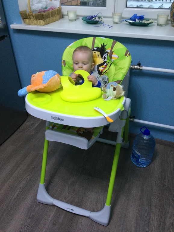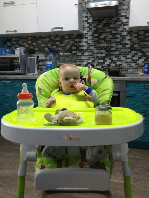 9.20-9.30Кирюше стало скучно в манеже, он запищал, несу его голопопить на кухню в свой новый стульчик, кладу игрушки, но его больше привлекает резиновый слюнявчик! Грызет его😁 Просыпается муж, умывается и идет к нам на завтрак)