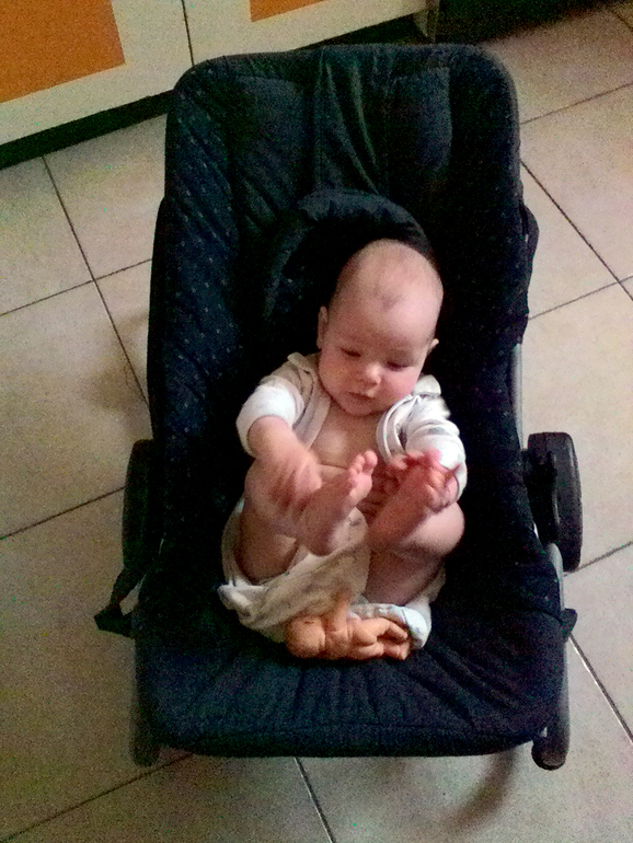 Из умелок: очень шустро вертится по дивану вокруг своей оси. умеет переворачиваться во все стороны, но с живота на спину на лево лениться капец. только на право куборем котиться. за то когда выхожу на пару сек из комнаты, знаю как положить чтоб к стенке котилась))) я пока хитрее))). уверенно стоит на четвереньках, раскачивается в перед-назад и чуть ползет назад. когда беру за обе ручки - подтягиваеться и садиться, но не сидит и даже еще не пытается. так же нет даже намека на зубы.