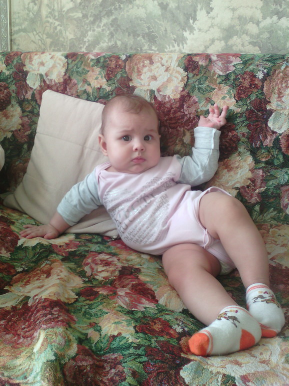 ЗнакомимсяВчера нашей любимой бусинке исполнилось 6 месяцев! Как быстро летит время... Дочка стала мегаактивная- иногда не успеваю за её действиями. Ползаем, сидим, стоим самостоятельно в кровати, возле дивана. Полиночка у нас скалолаз- перерезает и папу,и маму, и подушки- всё! Ну и несколько фотографий