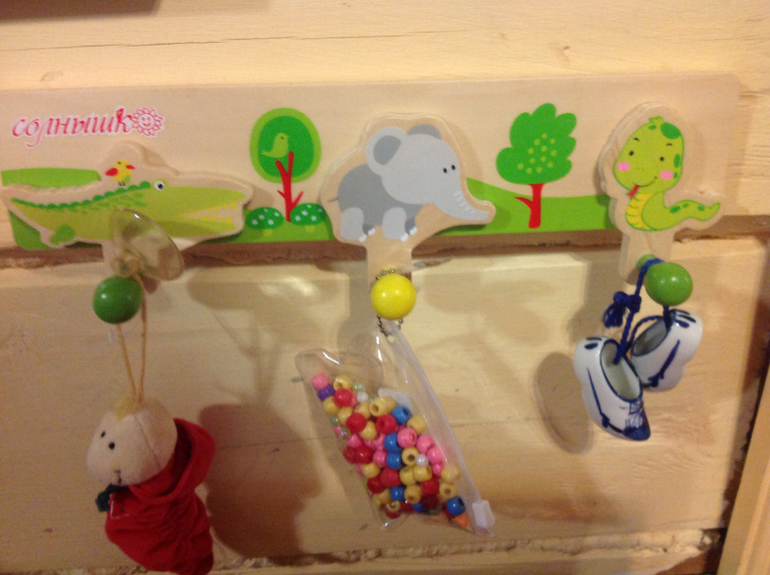 Человек стоит на диване и с большим удовольствием и пользой проводит свободное от мамы время. Снимает, манипулирует предметами, ощупывает, внимательно рассматривает, пробует на вкус, стучит, гремит, бросает, снова снимает и т.д. Может играть самостоятельно минут двадцать. Уже есть предпосылки к тому, чтобы повесить предмет обратно на крючок, а это - первый шажочек к сбору пирамидки, которую надеюсь осилить к году. Мама в это время завтракает по соседству, проверяет почту, развлекается на ББ и приходит в себя после ночного недосыпа.