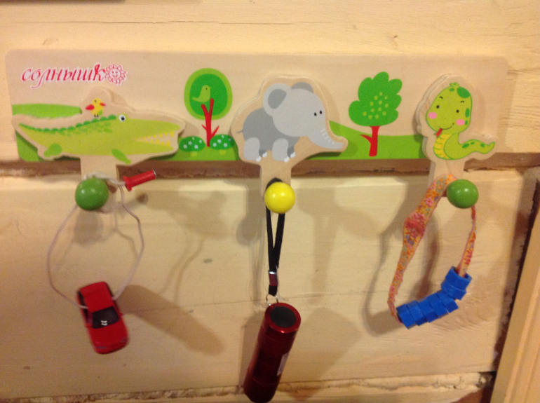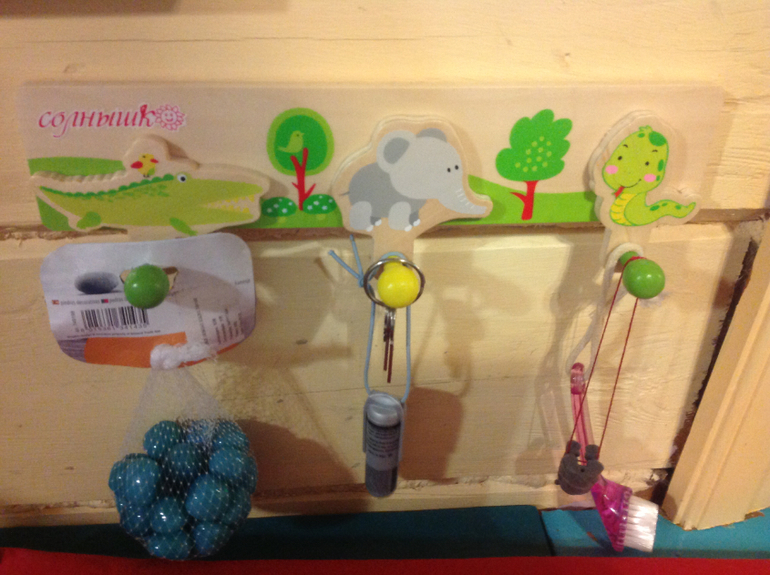 Теперь о наших играх. Ассортимент их существенно расширился по сравнению с прошлым месяцем. Человек окончательно вертикализировался, сидеть и лежать не желает, поэтому придумала вот такую штуку. Долго не знала, как приспособить милую вешалку, купленную случайно. Провела ревизию закромов, поиграла сама с собой в игру "найди в доме все, что с дыркой". В ход пошли предметы, обладающее функцией навешивания-нанизывания: брелки, резинки, бусы, хозяйственные мелочи и т.д. В результате имеем универсальное "сенсорное" пособие, отвечающее требованиям сегодняшнего дня. Вот несколько примеров его использования.